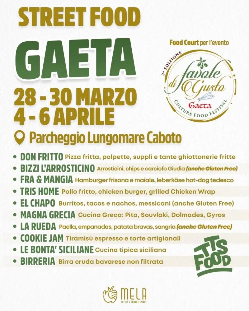 Il 28/29/30 marzo e il 4/5/6 Aprile 2025, per la prima volta il TTS Food arriva a Favole di Gusto, l’evento gastronomico più atteso di Gaeta. Il TTS Food allestirà il suo format all’interno del parcheggio su Lungomare Caboto che sarà trasformato in un villaggio Street Food unico nel suo genere: gustoso, colorato e pronto a regalare tre giorni indimenticabili. Il Comune di Gaeta si conferma ancora una volta protagonista nell’organizzazione della terza edizione dell’evento più gustoso della costa laziale.