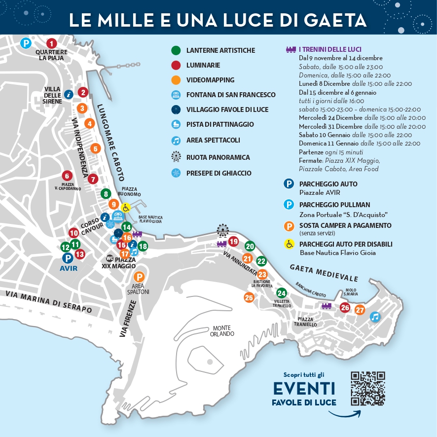 Oltre alle celebrazioni e agli eventi in programma, il cuore della rassegna “Favole di Luce” batte attraverso le sue magnifiche installazioni luminose che trasformano Gaeta in un museo a cielo aperto. Con punti di attrazione, installazioni artistiche, videoproiezioni, lanterne di luce distribuiti in tutta la città, il percorso offre un viaggio indimenticabile tra fiaba, storia e natura.